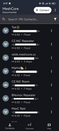 MeshCore se dá obsluhovat mimo jiné pomocí mobilní aplikace. Je stejná pro platformu Android i iOS - jediný rozdíl je ve správě Bluetooth, tomu se zatím věnovat nebudeme. Obsluha MeshCore pomocí mobilní aplikace je nejčastější způsob použití MeshCore sítě.